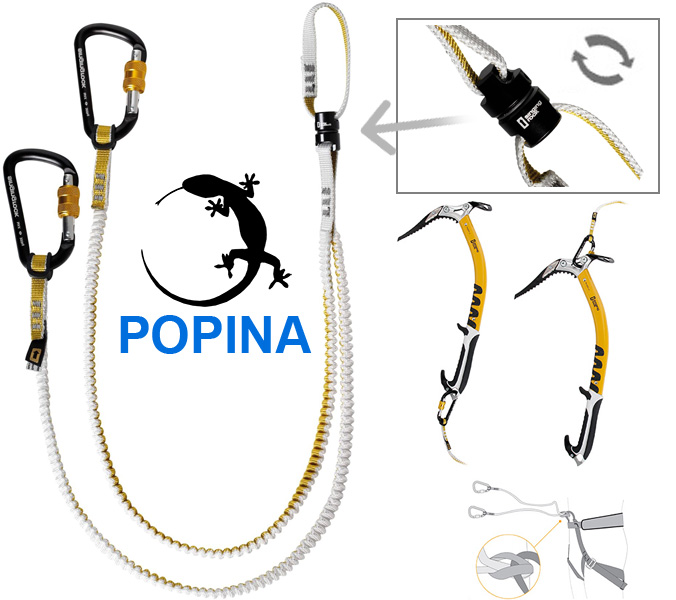Elastyczna lonża do czekanów technicznych w wersji z krętlikiem. Bungee zabezpiecza czekany przed niekontrolowanym upadkiem podczas odpadnięcia lub nieostrożnego wspinania. Elastyczne lonże ułatwiają swobodne operacje z czekanem, skracając się automatycznie i nie przeszkadzając we wspinaczce. Model posiada dwa karabinki o maksymalnej wytrzymałości 3kN, przeznaczone do podpięcia czekanów. W cenie są 2 karabinki.